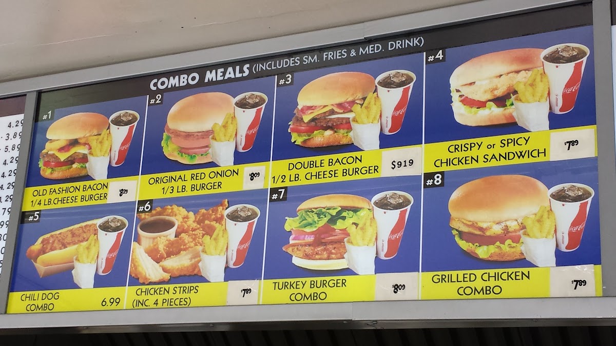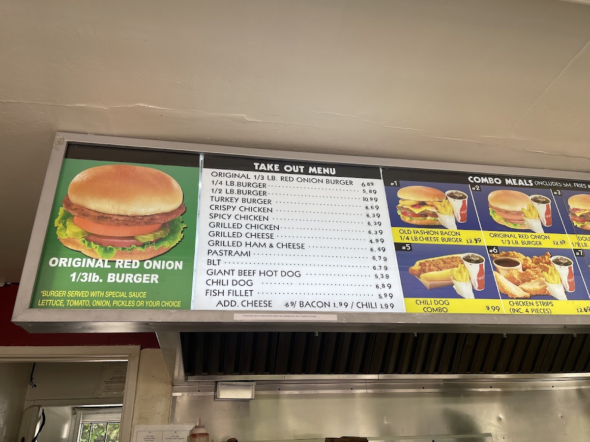 The menu features a standout Old Fashioned Bacon Cheese Burger, crafted with a 1/4 lb beef patty, crispy bacon, and a medley of fresh toppings. The Original 1/3 Lb Red Onion Burger is also a must-try, boasting a juicy patty and that signature touch of thinly sliced onions.